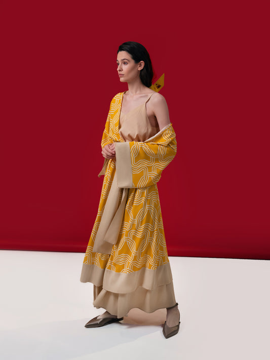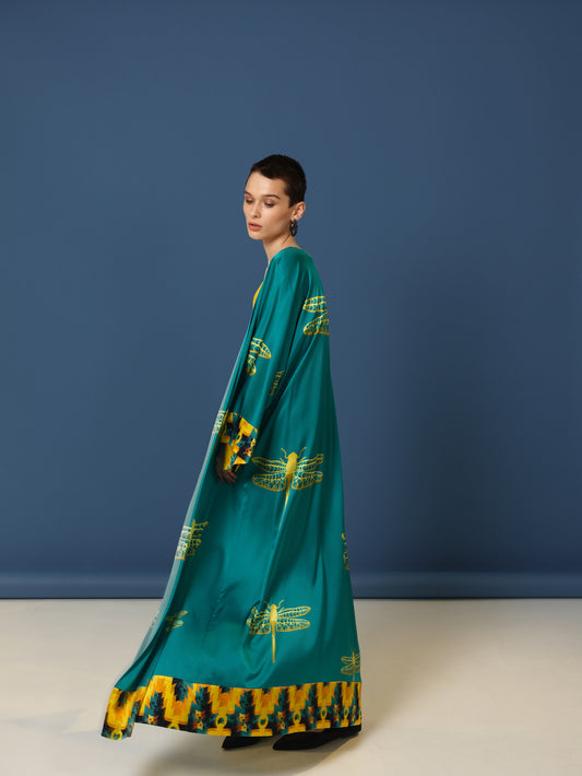 A woman in a dress connected to the earth, as part of a landscape. Fluttering in the wind, waiting for a bird to fly out of her pocket. Green drapery, giving the feeling of the crown of a tree.