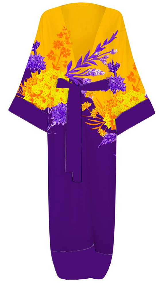 Splendidly blossoming you will be in this beautiful caftan in purple-yellow color scheme. Bright radiance, inherent to spring, will be sure to you. Handmade from Italian matte silk, this caftan is a unique pleasure to wear on any occasion, be it personal or professional, casual or elegant, it is a real feast for the eyes.