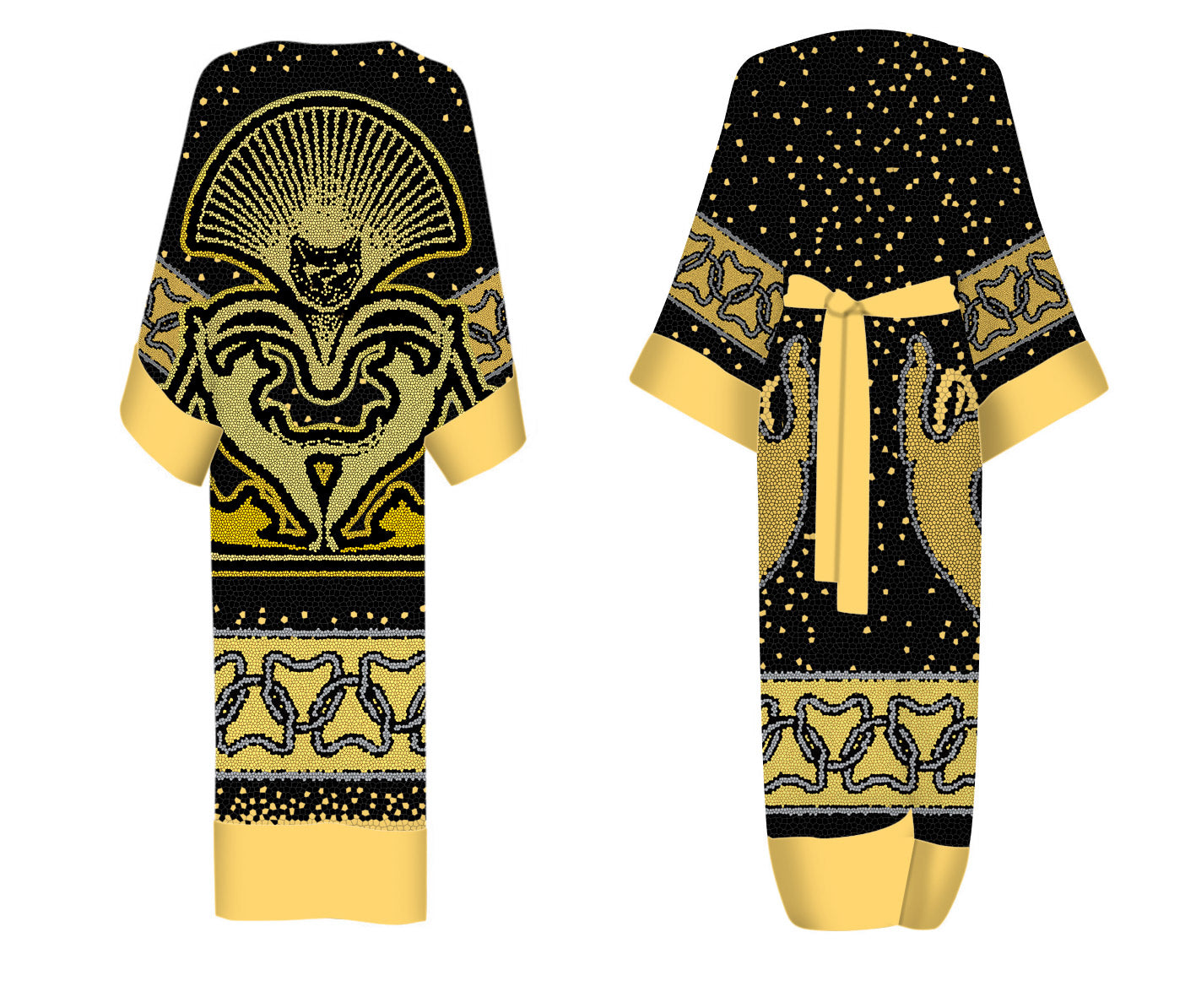 'Royal' in gold black silk, this mosaic print uniquely highlights the mystique and femininity of any woman. Handmade in matte Italian silk look, this caftan weakness in every woman a queen, day or evening, a true pleasure experience, haptic and visual: whether worn with a dress, slim look, to the gala event, party or completely private, casual as well as noble, royale Noblesse.