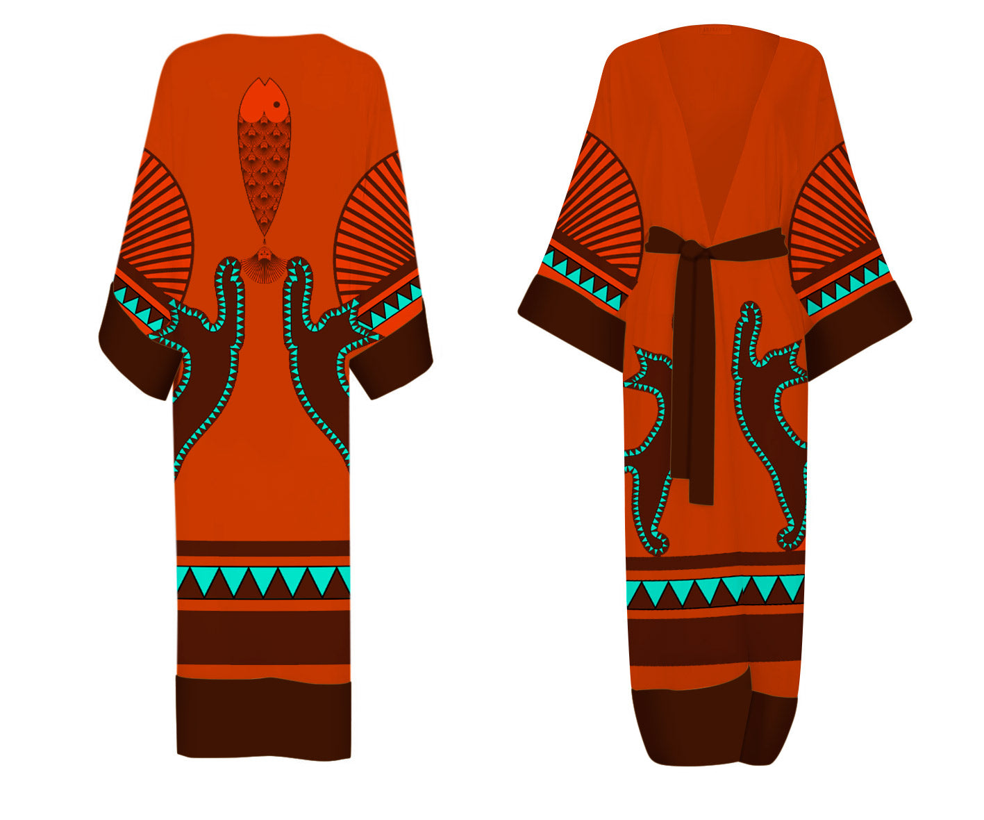 A tribute to joy and happiness embodies this caftan in beautiful orange and warm brown. As light-filled as a star, it will make you the center of attention in any encounter, including the one with yourself. Wear this 'light-filled Happiness' made of Italian matte silk, private or business, all seasons, classy, casual, as a dress or 'over the top', all seasons, and joy will be on your side.