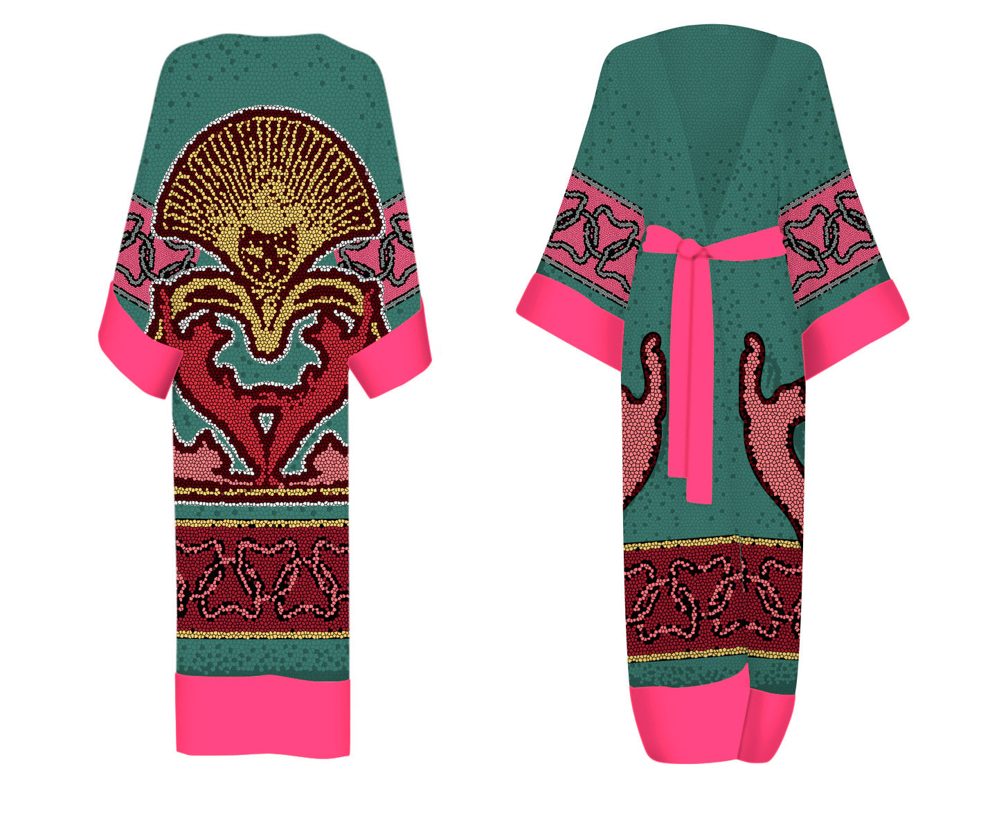 With the mosaic print ArtRamus in unique fresh complementary color combination, green and fuchsia, underlines mysticism and femininity of any woman. An almost royal appearance, whether business or private, worn casually or elegantly, with a dress, slim look or with a swimsuit, made of 95% silk a true pleasure experience.