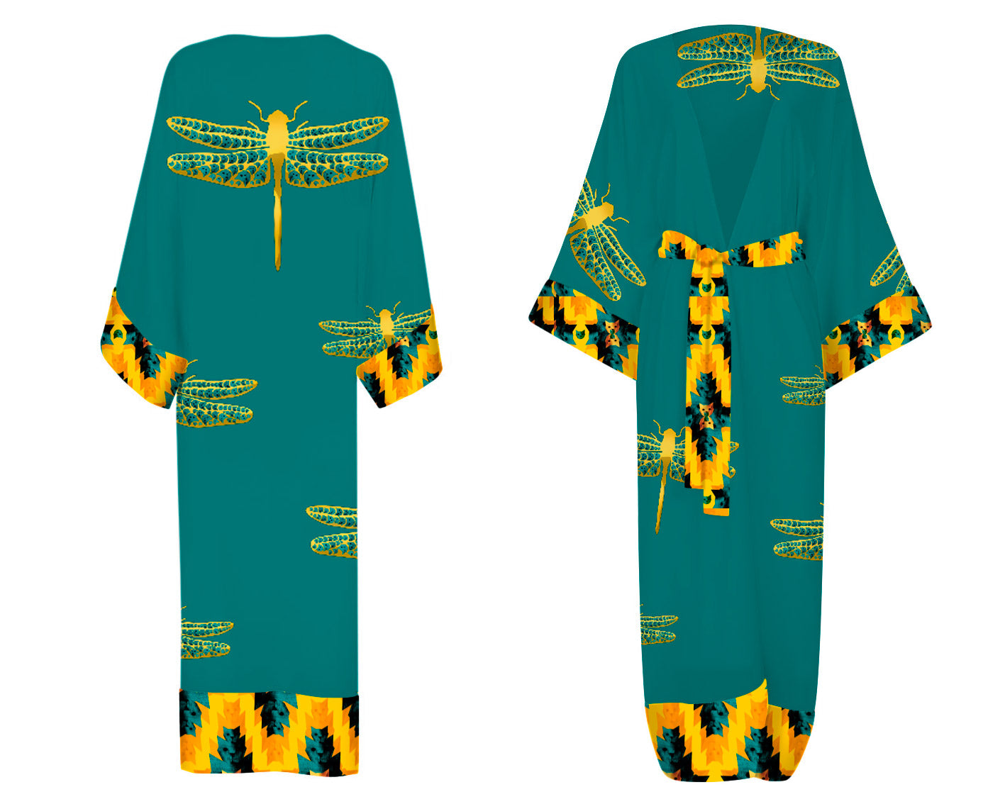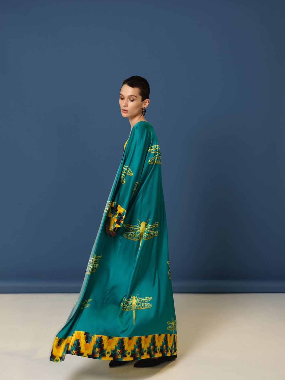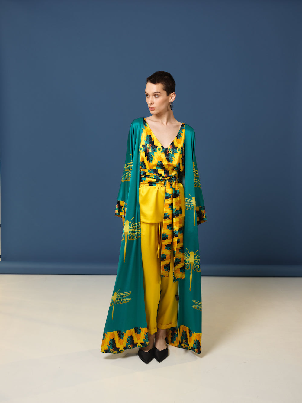 In königlicher Leichtigkeit lässt Sie dieser in glänzender Seide handgefertigte Kaftan dorthin ‚schweben‘, wo Sie am liebsten verweilen wollen. In Türkis und akzentuiertem sonnigem Gelb fühlen Sie herrliches Lebensgefühl, fast das einer schillernden Libelle gleich. Das Wo und Wie ist ganz Ihnen überlassen: alles ist möglich, von gesellschaftlichem Anlass bis hin zum Pool oder wunderschön Zuhause.