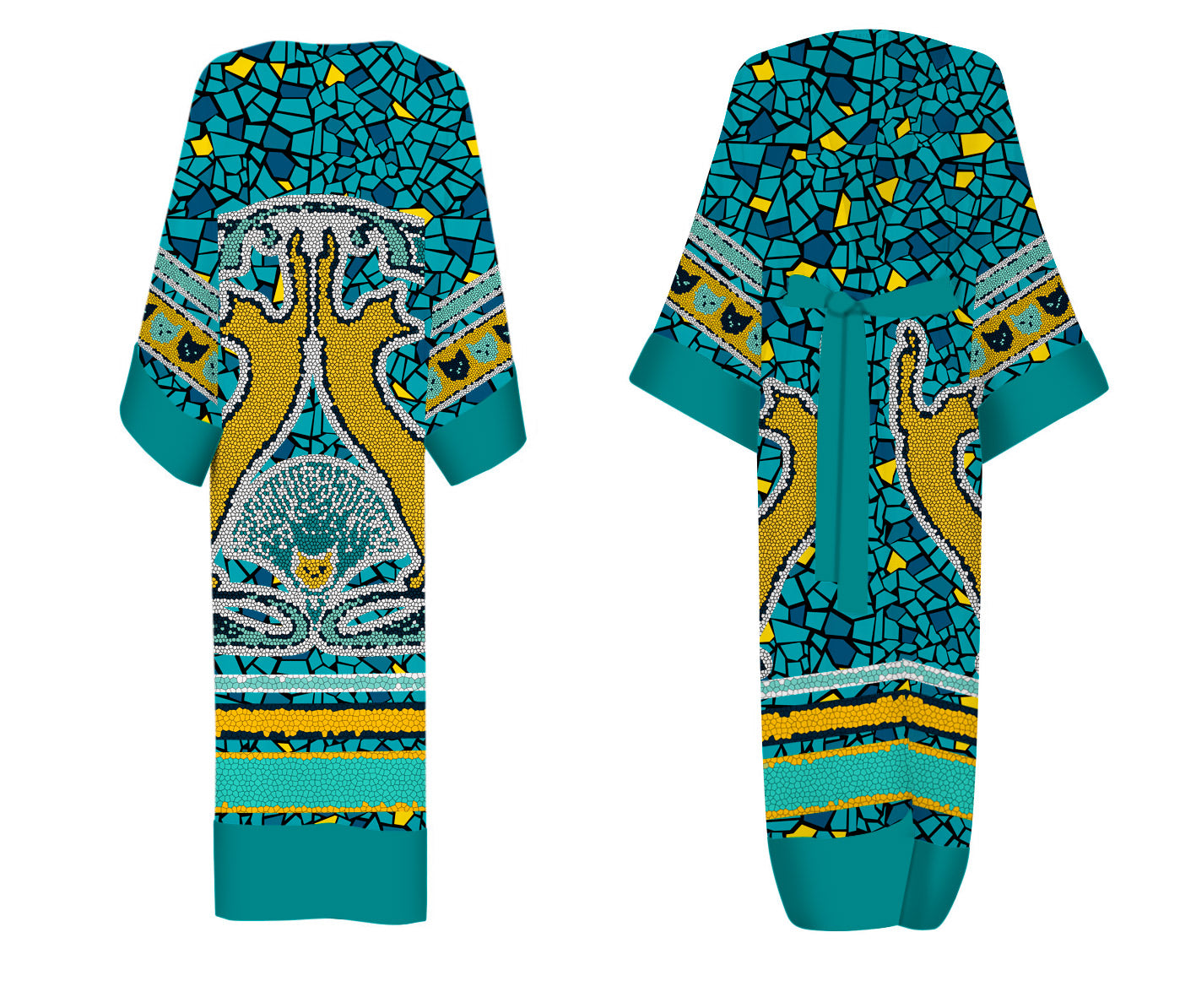 A noble and noble charisma gives you this almost royal caftan in mosaic print. Relaxingly Mediterranean, a bit oriental, it embraces you in turquoise with a touch of gold in beautifully shiny Italian silk. A truly regal appearance is assured whether private or professional, event or party, all seasons, classy, casual, worn as a dress or elegant 'over the top'.
