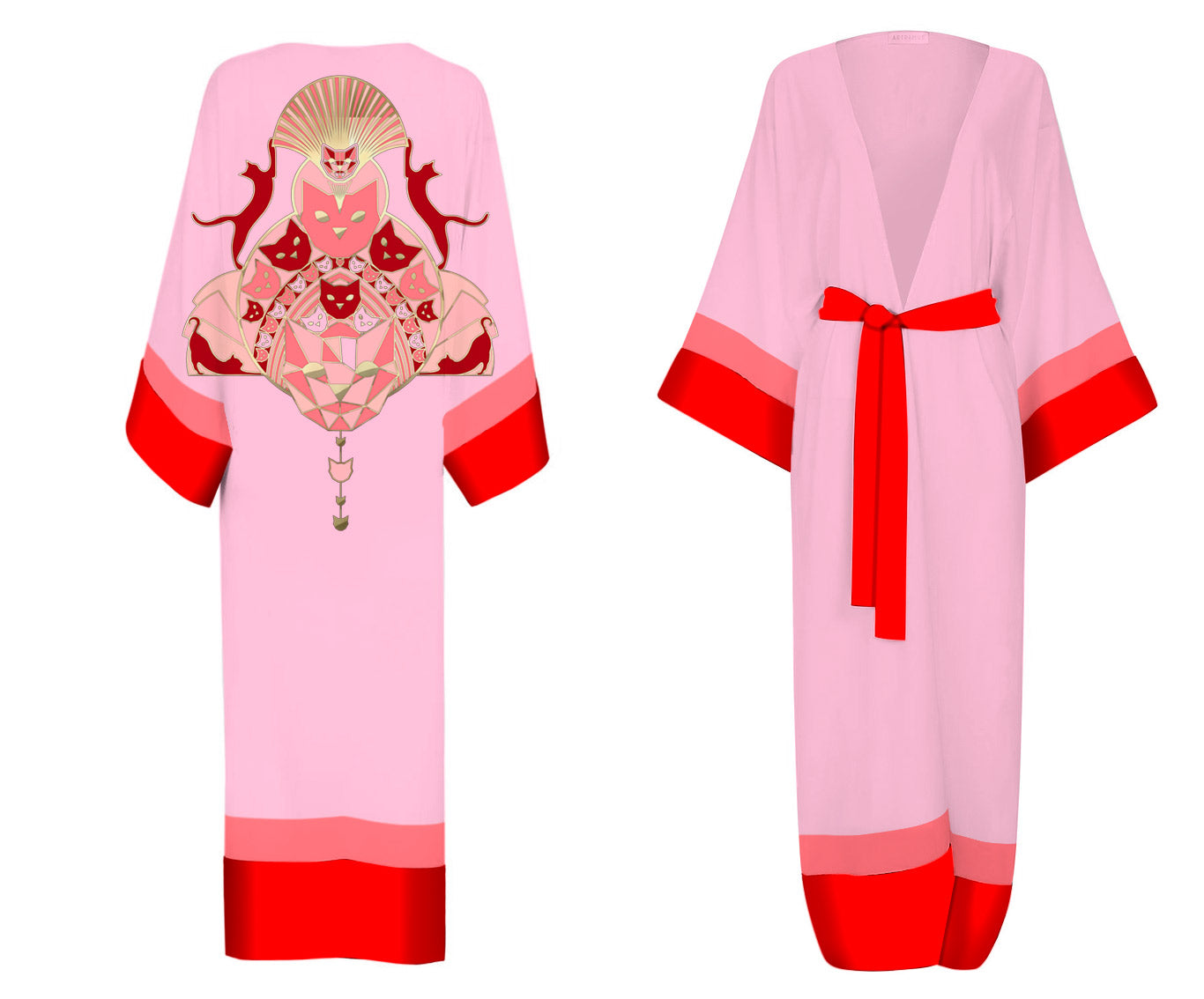 Long caftan ''Fiery red meets tender rosé'' in Royal Cat design